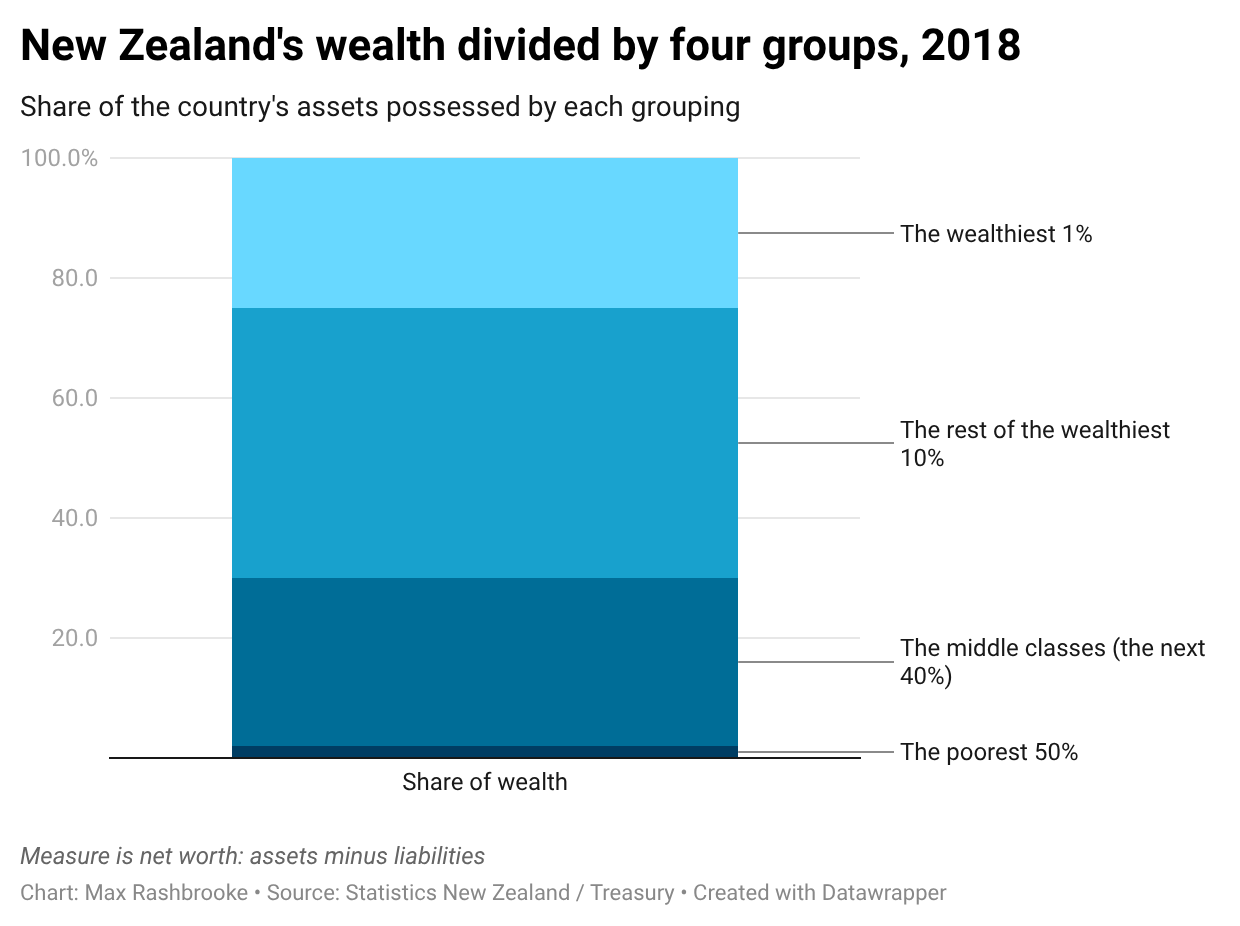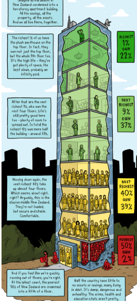 Wealth – houses, businesses, cars, financial investments – is even more unequally distributed than income. In New Zealand the wealthiest 1%, around 40,000 adults, own one-quarter of the country’s assets, while the poorest half of the country has just 2 per cent.