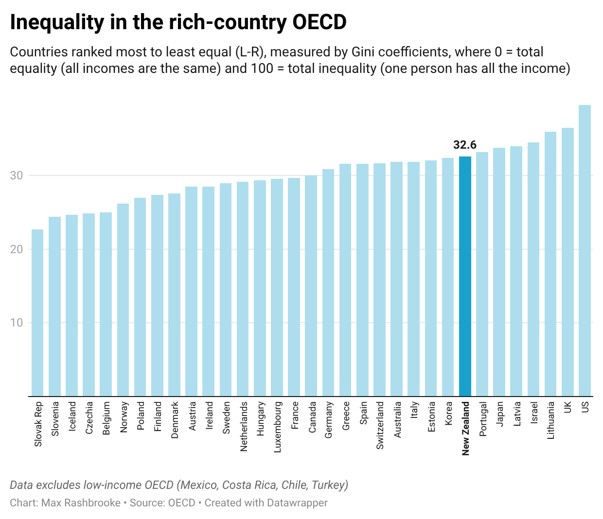 When it comes to income disparities, New Zealand is one of the more unequal of the richer nations. The graph below shows the OECD, sometimes called the ‘club’ of richer nations, minus the low-income countries to which New Zealand does not usually compare itself (Mexico, Chile, Costa Rica and Turkey). The measure is the Gini coefficient often used by statisticians, which adds up all a society’s income differences and combines them into one number. A Gini coefficient of 0 would indicate perfect equality (everyone has the same income) while 100 would indicate perfect inequality (one person has all the income). New Zealand is towards the unequal end of the spectrum.